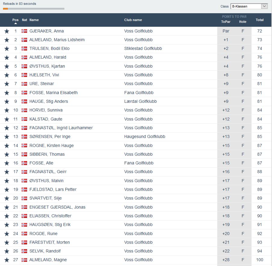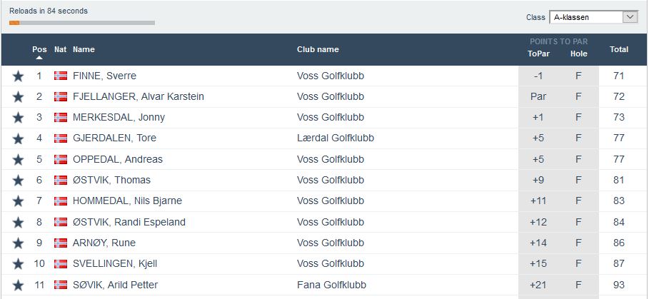 Heile 39 golfarar trossa vêrgudane og stilte til start då Belka Golf Nordic Open vart arrangert søndag 9.juni. Tre klassar med slaggolf 100% hcp. Klasse A (>15,0 hcp). Klasse B (15,1-36.0 hcp) og Klasse C (<36.0 hcp). I tilleg var det ein samla klasse for alle der vinnaren kunne vinna den gjeve fyrsteprisen som er ei vekes opphald i Tyrkia til hausten. Den stakk ingen ringare enn Sverre Finne av med. Resultata for kvar klasse finn du under.