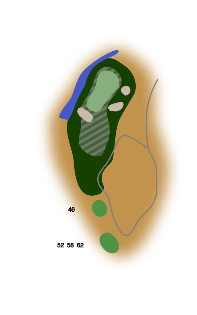 Utslaget ligg høgt med utsikt til fire bunkrar, vannhinder bak og til venstre for green, samt rough i blindsona i nedslagsområdet til høgre. Ondulert green som stig godt frå midten og framover.