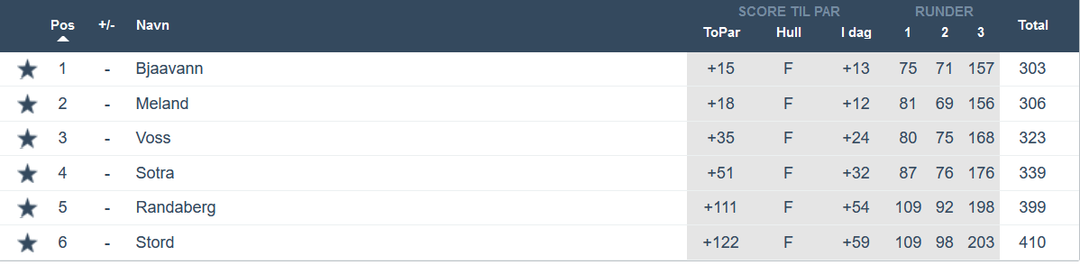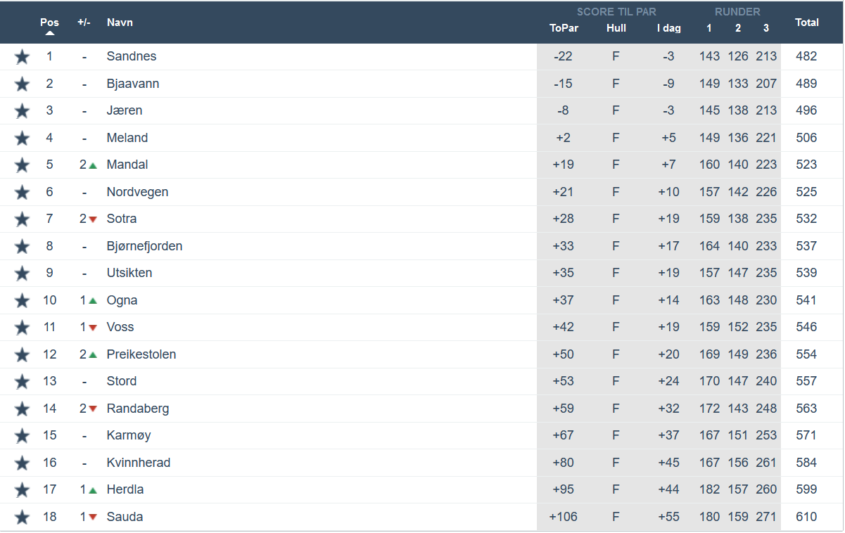 Søndag var det klart for singelrundar og her rykka Meland litt i frå slik at det til slutt vart ein god 3.plass på damene der Randi spelte på 82 og Maria på 86. Mennene spelte også jamnt med Marius på 77, Alvar og Jonny på 79 og Andreas på 80. Det heldt til slutt til ein 11. plass. Resultatlistene for både damer og menn finn du under.