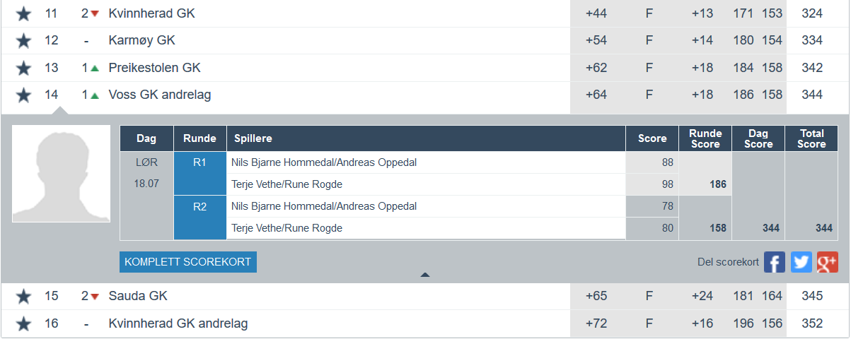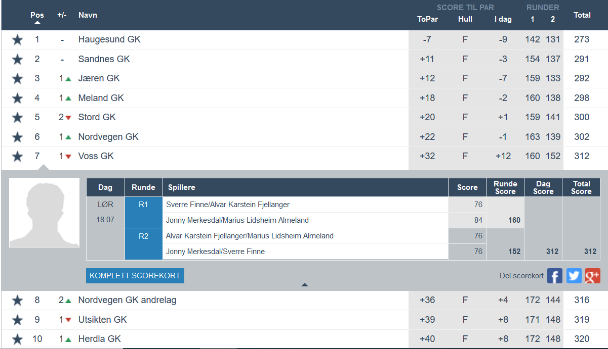 Ikkje mindre enn to herrelag frå Voss Golfklubb stiller til start på årets lag-NM på Nordvegen GK nær Haugesund. Lag 1 med Sverre Finne, Alvar Fjellanger, Jonny Merkesdal og Marius Lidsheim Almeland ligg på ein 7.plass med 312 slag etter dei to rundane i dag. Lag 2 med Nils Bjarne Hommedal, Andreas Opedal, Terje Vethe og Rune Rogde ligg på 14.plass med 344 slag. Dagens rundar var fourball og foursome, mens i morgon er det singelrundar. Under kan du sjå dagens resultat og i morgon er me tilbake med dei endelege resultata.