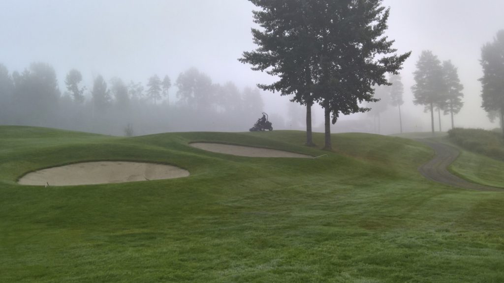 PS. Nedenforståande bilde frå ein tirsdagsrunde i går, i etterkant av ein regnfri mandag, og med strøkne fairways, samt av vår greenkeeper Torstein på green 4 før tåka letta på lørdag.
