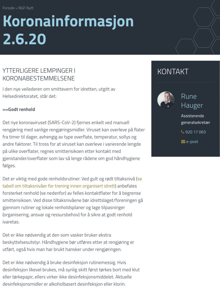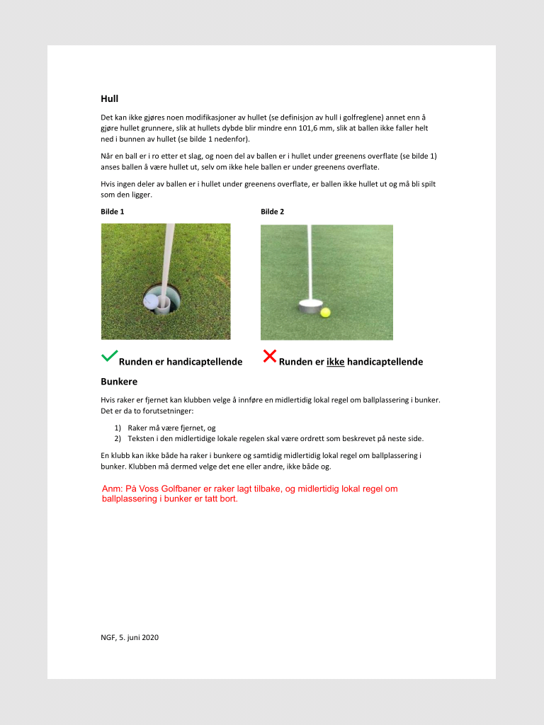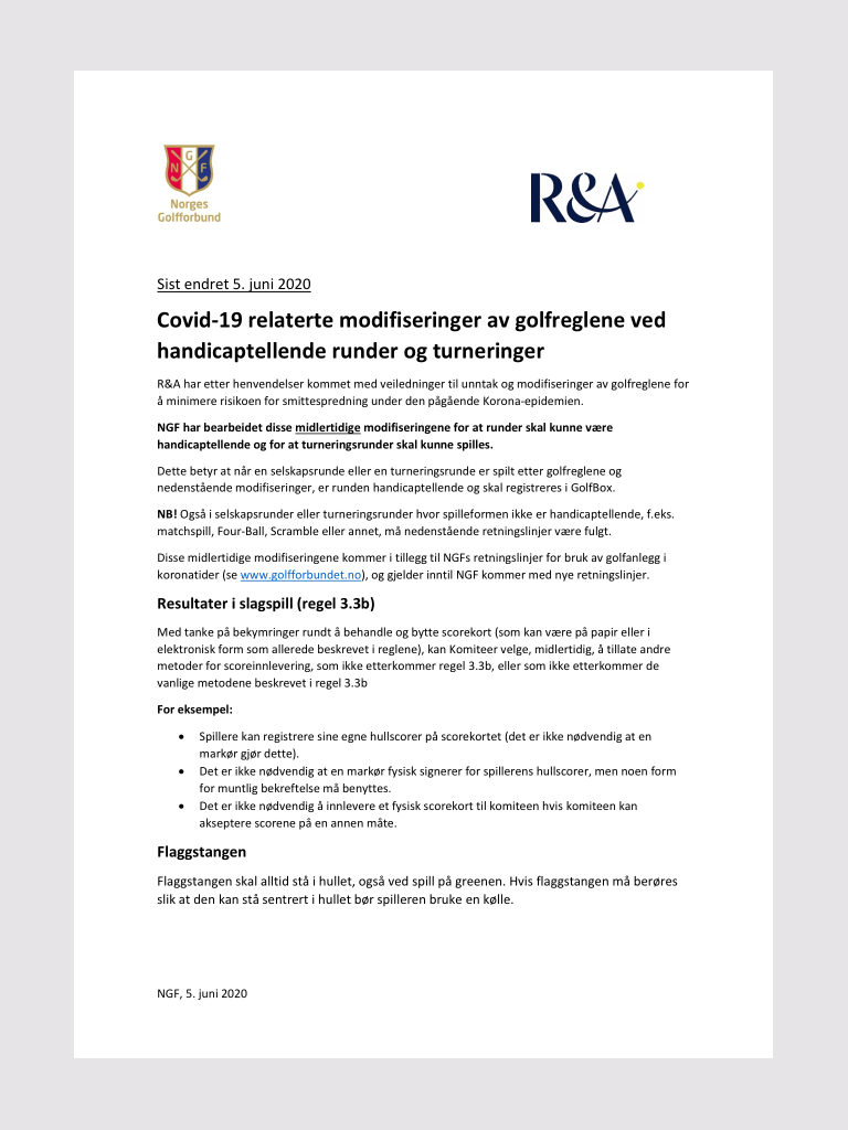 Det har nå komme ytterligare lempinger i Koronabestemmelsene. Dei nye er langt mindre konkrete enn dei opprinnelige, og kan vel oppsummeres til at flaggene fremdeles skal stå i fred, men ellers er det å vaske hender, og ikkje ta seg til ansiktet. Merk også at bunkers raker no er tillatt, og at lokal regel omkring pallplassering i bunker difor er fjerna.