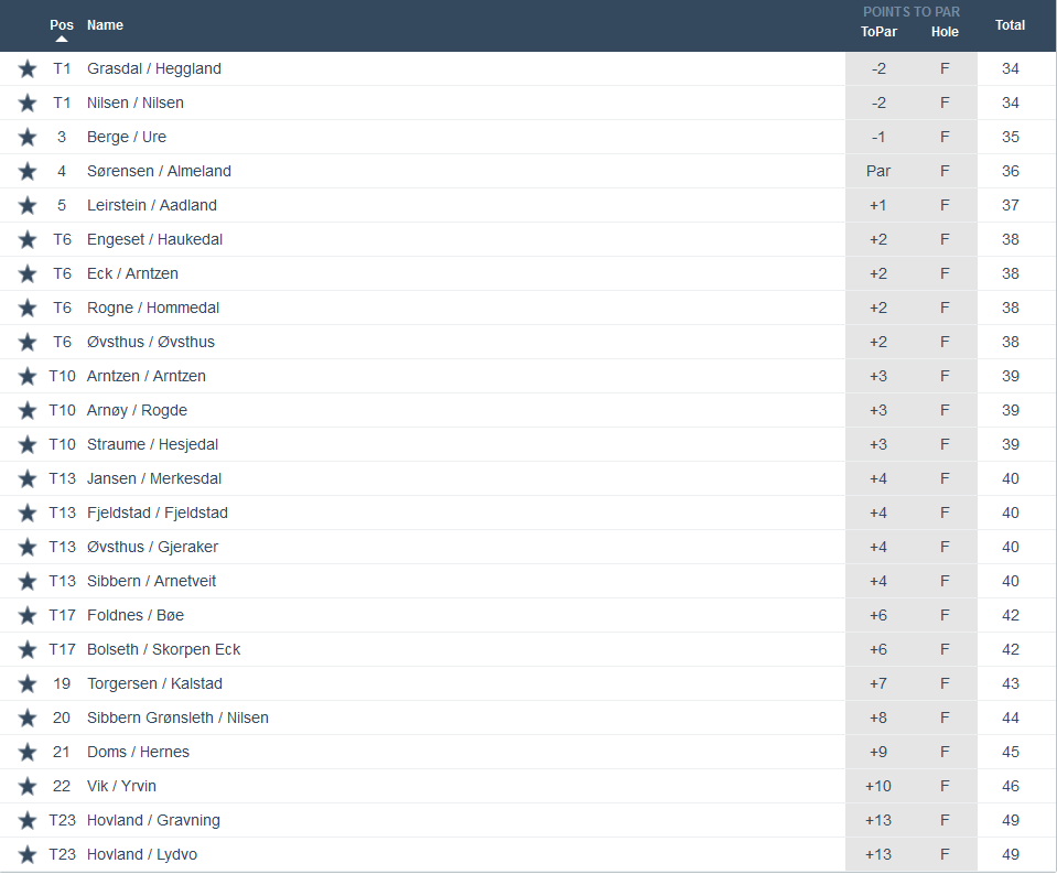 Golf, grilling, Greensome eller eventuelt i ei anna rekkjefølgje er ei fin sosial turnering som vert avholdt i slutten av juni. I år ingen unntak og vinnarane av greensomen vart Heggland/Grasdal og Nilsen/Nilsen. Begge på -2. Kven som vann golfen og grillinga har me dessverre ikkje noko svar på, men resultata til dei 24 para som stilte til start vart som følgjer: