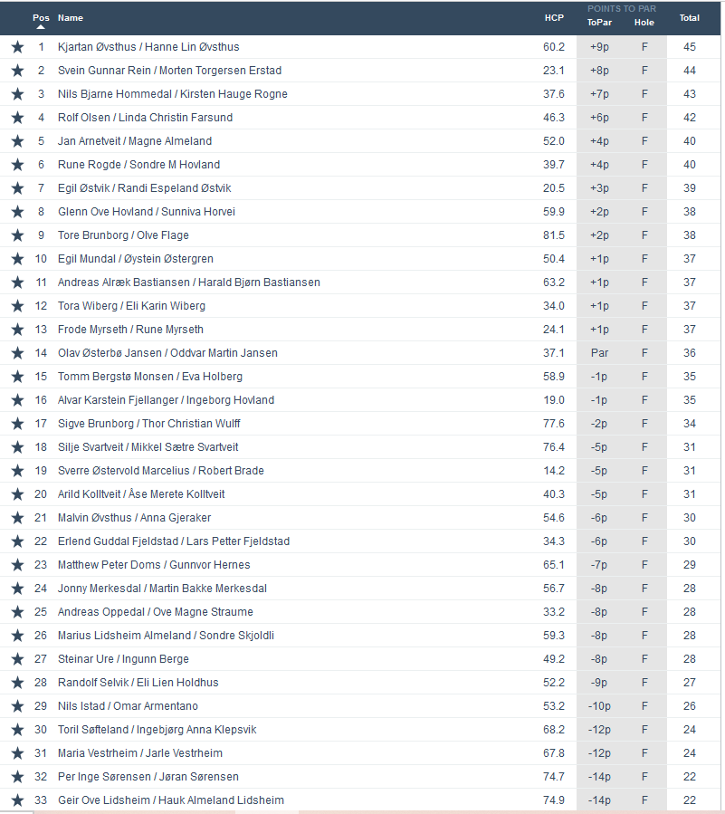 Heile 33 lag og då 66 deltakarar kjempa om årets Golfhefte Trophy og det var til slutt Kjartan og Hanne Lin Øvsthus som stakk avgårde med sigeren. Morten Erstad og Svein Gunnar Rein frå Bjørnefjorden tok andreplassen berre eit slag bak og berre eitt slag bak der igjen kom fjorårsvinnarane Nils Bjarne Hommedal og Kirsten Hauge Rogne.