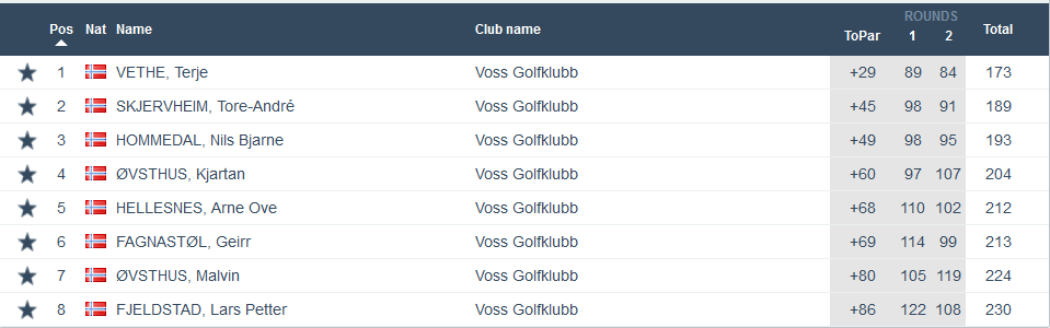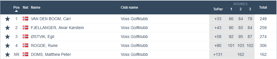 Då var tida komen for å kåre årets klubbmeistrar. Det vart ei våt helg for mange, men seks meistrar fekk me til slutt. I to av klassane, A-Herre og B-Dame, vart det spela heile 54 hol. Her var det slagspel og best av alle herrane vart Carl van den Boom på +33. Alvar Fjellanger vart nummer to med +43. I dameklassen var det berre to deltakarar, men her var det svært jamnt. Randi Østvik på +79 vann med berre to slag på Maria Vestrheim.