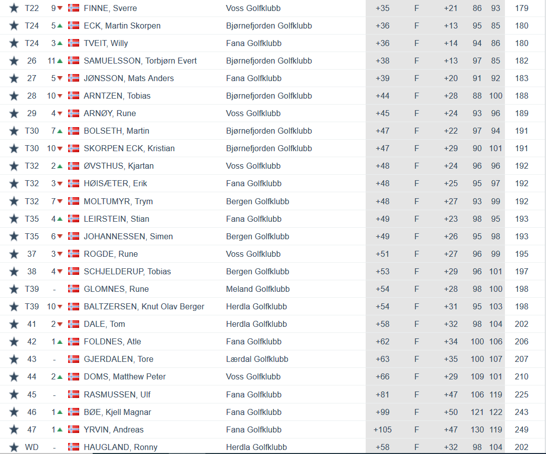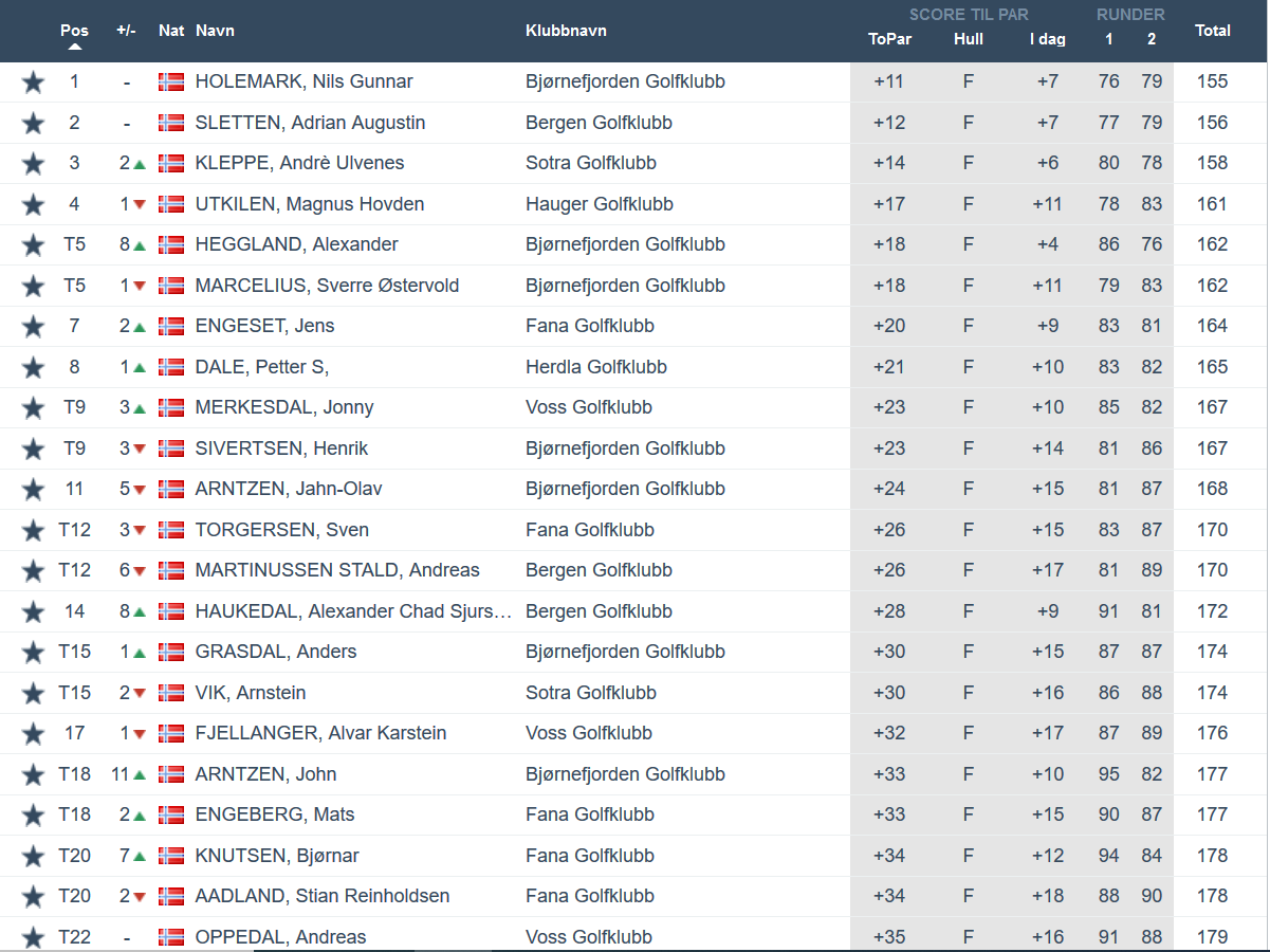 Nils Gunnar Holemark frå Bjørnafjorden GK trekte det lengste strået med 11 over par, berre eitt slag framfor Adrian Augustin Sletten frå Bergen GK som då hadde 12 slag over par. André Ulvenes Kleppe frå Sotra GK tok tredjeplassen med 14 over par. Dei tre herrane kan de sjå på bilete over. Fullstendig resutlatliste for alle dei 47 deltakarar nedenfor.