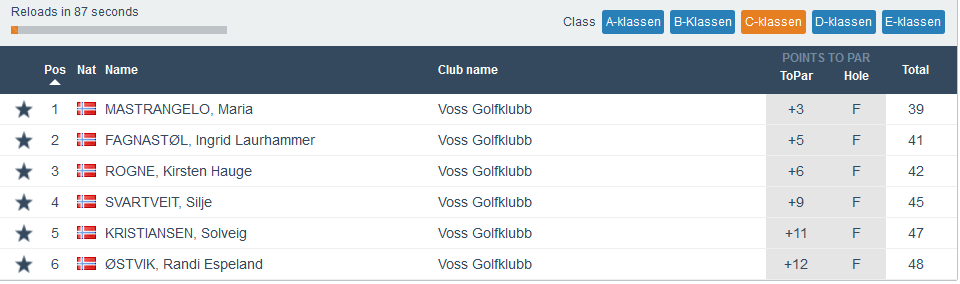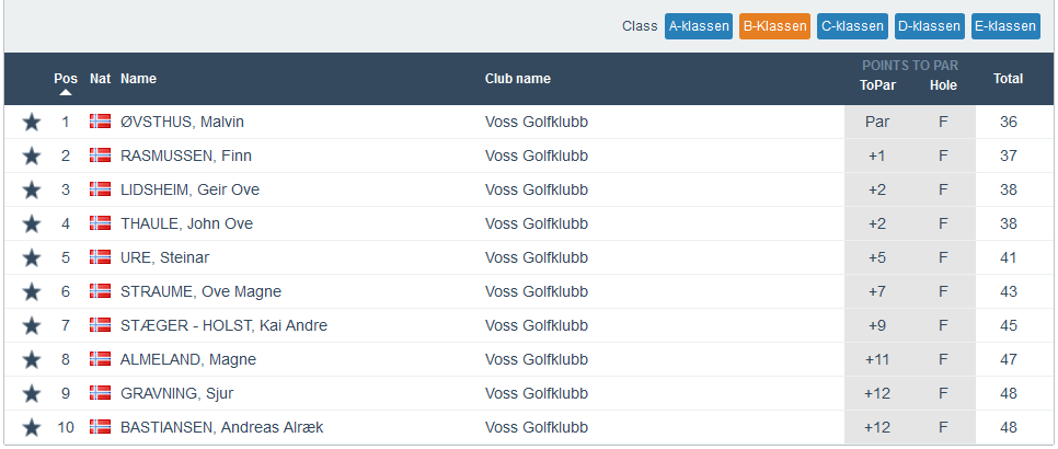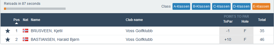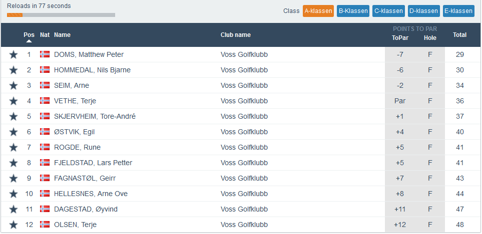 Superrunden er i gang igjen og på ny er me klar for 8 rundar som til slutt vil gje oss ein samanlagtvinnar. Onsdags kveld vart den første runden avholdt og vinnar vart Matthew Peter Doms med imponerande -7. Underteikna meiner å ha møtt Matthew ute på bano i sommar klokka 6.30. Då ute på trilletur/golftur med si vetle jente. Heilt klart at kombinasjonen barnepass/golfpseling har bært frukter 🙂 Nils Bjarne Hommedal har også trent bra i sommar, ikkje minst då han sist onsdag var den einaste som møtte på fellestrening og fekk god oppvartning av Sverre. Dette bar frukter og han enda berre eitt slag bak Matthew på -6. Så her ser de folkens at trening hjelp! 😉 Arne Seim varta opp med den tredje beste scoren i dag på -2. Alle desse spela i klasse A. I klasse B vann Malvin Øvsthus på par. I klasse C vann Maria Mastrangelo på +3 og klasse E vann Kjetil Brusveen på -1. 30 deltaktarar er ein god start for haustens Superrunde, men det er plass til endå fleire også. Resultat for alle som var med føl under.