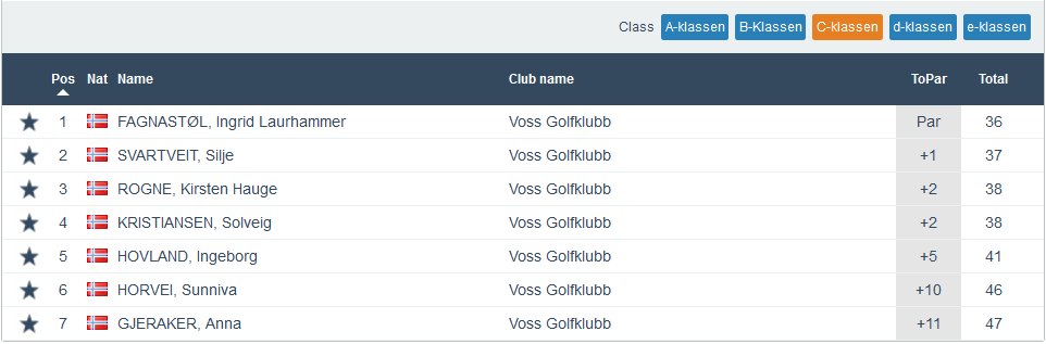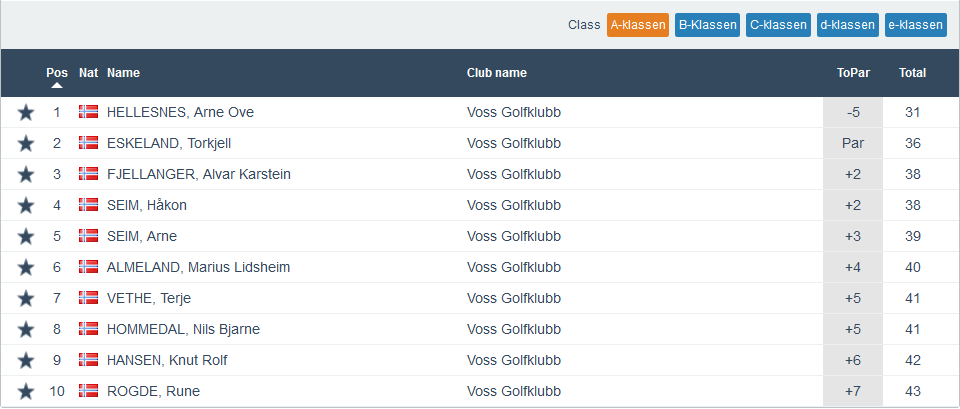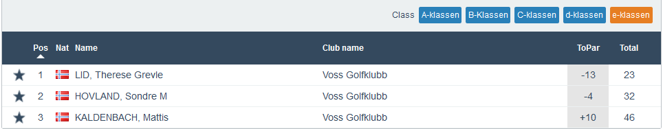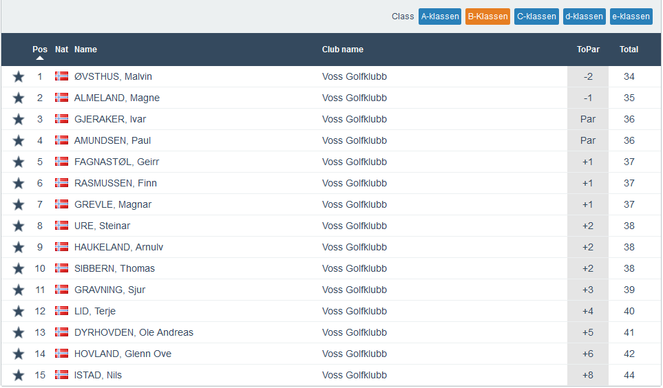 Heile 35 spelarar denne onsdagen og det er jo glimrande når det framleis berre er spelarar frå Voss Herad som får spele denne turneringa. Best av alle denne kvelden var Therese Grevle Lid som gjekk heile 13 slag under sitt par. Ho vann dermed klasse E framfor Sondre M Hovland som hadde -4. Ein annan veldig god score stod Arne Olav Hellesnes for i klasse A, då han gjekk på 5 under sitt par og det heldt sjølvsagt til siger her. I klasse B, med heile 15 deltakarar, vann Malvin Øvsthus på -2 og i klasse C vann Ingrid Laurhammer Fagnastøl på par. Fulle resultatlister føl under.
