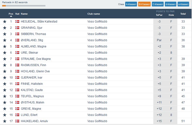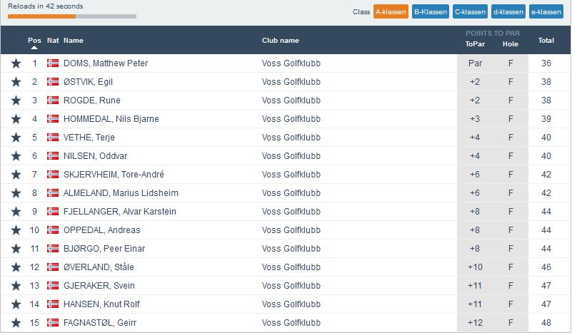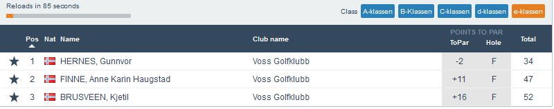 Heile 42 spelarar denne fine kvelden er ikkje noko anna enn imponerande. I dag var det ikkje mindre enn tre vinnarar og alle var også frå same klasse, nemleg klasse B. Ståle Kallestad Hesjedal, Thomas Sibbern og Sjur Gravning kunne alle notere seg for ein -3 runde og dermed krone seg som sigerherrar i den fjerde superrunden i år. Gunnvor Hernes, som vann klasse E, nådde nesten opp med sin -2 runde og desse fire var dei einaste som var under par i dag. I klasse A vann Mattew Peter Doms på par og i klasse C vann Sunniva Horvei på +1. Me gratulerar! Resultat frå alle klassar føl under.
