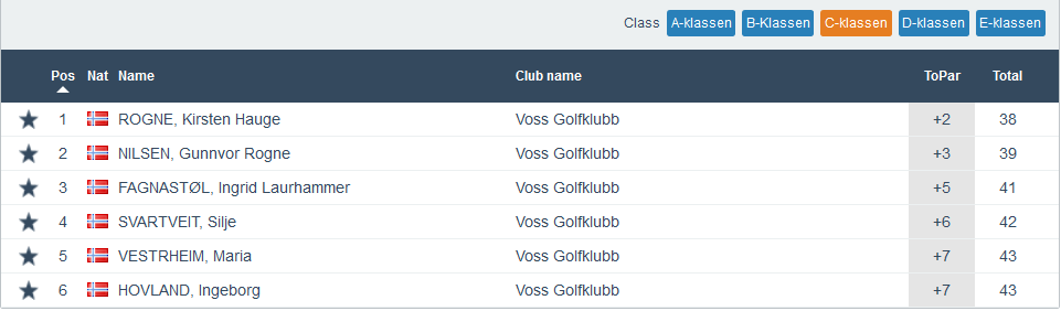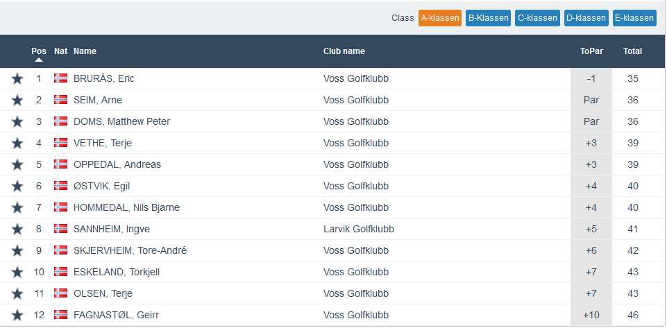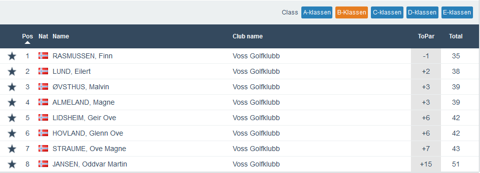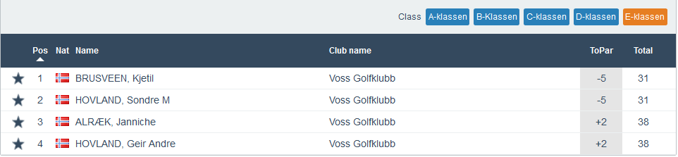Då er me halvvegs i årets haustrunde når det gjeld Superrunden. 30 spelarar stilte opp onsdags ettermiddag og utover kvelden så var det Kjetil Brusveen og Sondre M Hovland som viste seg sterkast. Begge fekk scoren -5, men klassevinnaren vart Kjetil Brusveen grunna lågare handicap. Dei andre klassevinnarane vart i klasse A, Eric Brurås på -1. I klasse B, Finn Rasmussen, han også på -1. I klasse C vart den sterkaste dama denne ettermiddagen Kirsten Hauge Rogne på +2. Me gratulerar og bilete av alle vinnarane ser du under. Under der igjen finn du fulle resultatlister for kvar klasse.