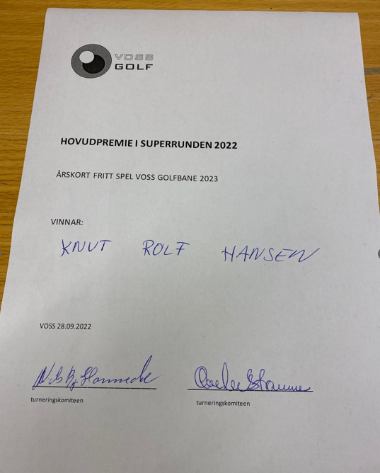 Vinnaren av fritt spel 2023 som vart uttrekt på scorekort vart Knut Rolf Hansen. Me gratulerar alle vinnarane og ynskjer velkomne tilbake til Superrunden 2023.