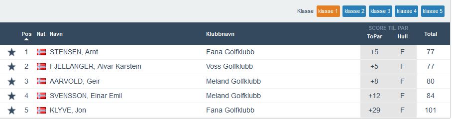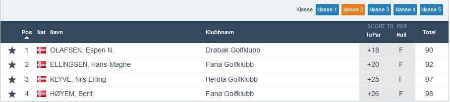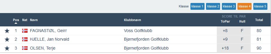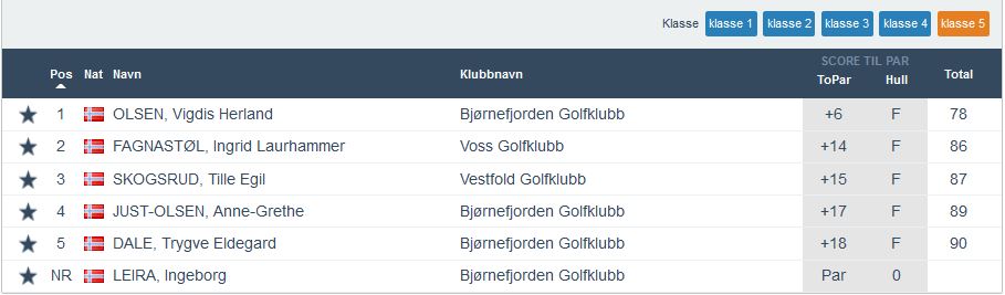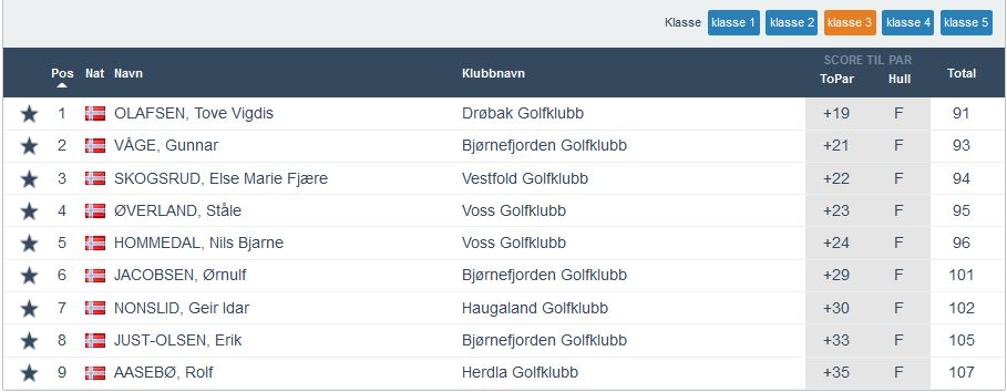 Sissener Classic Tour (NSG weekend) – 15.juni Her er resultata frå første dag av Sissener Classic Tour laurdag 15.juni, med bilde av klasse vinnarane🏌️♀️🥇 Gratulerer!🏆 Klasse 1: Klasse 2: Klasse 3: Klasse 4: Klasse 5: Forrige Neste
