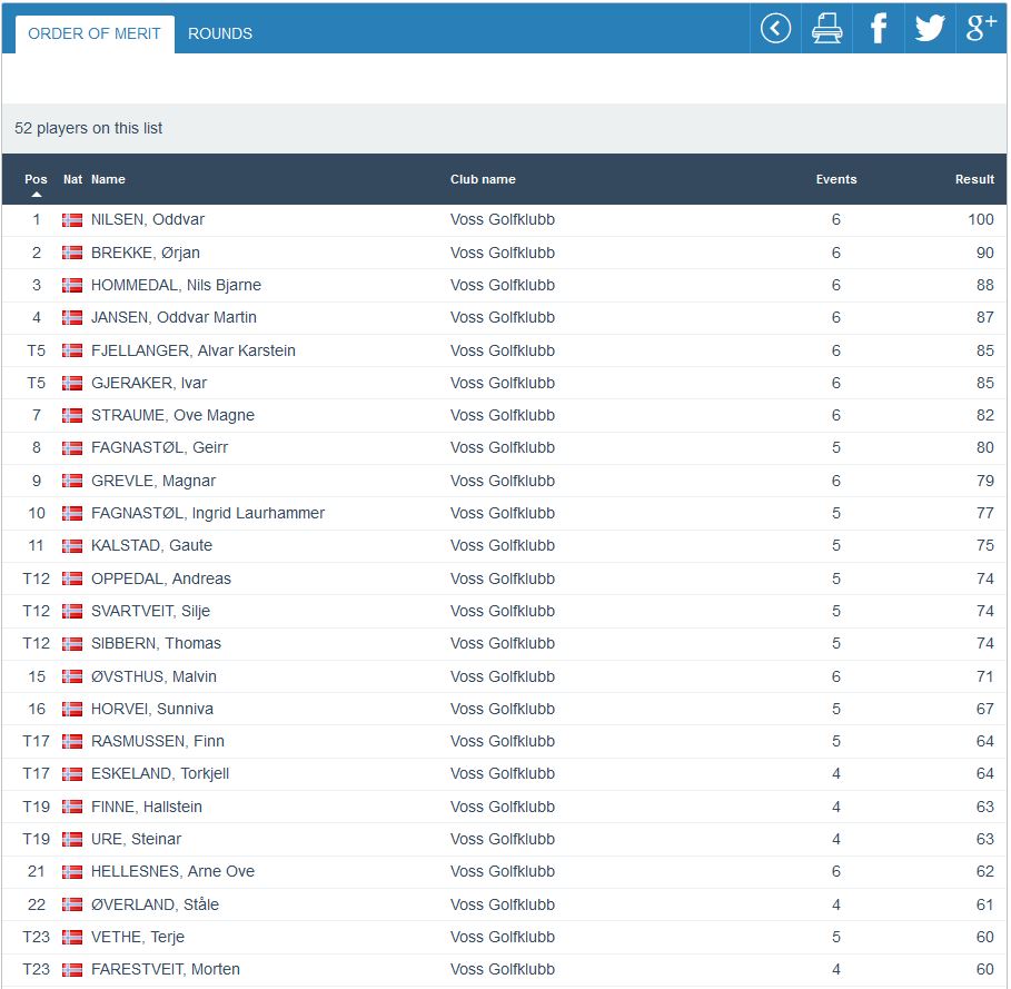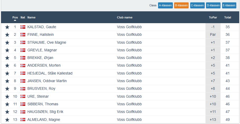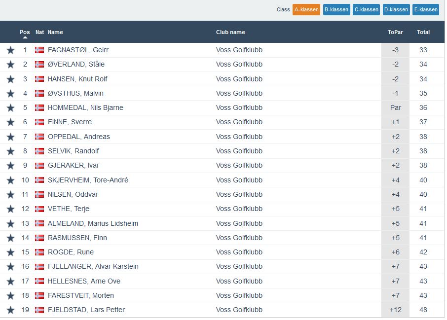 God deltaking igjen med 38 glade golfarar denne onsdagskvelden. Vinnarar vart Geirr Fagnastøl, Gaute Kalstad, Gunnvor Rogne Nilsen og Glenn Ove Hovland. Me gratulerar! Samanlagt er det framleis Oddvar Nilsen som har eit godt forsprang med to rundar igjen. Fulle resultalister for kvar klasse finn du under.