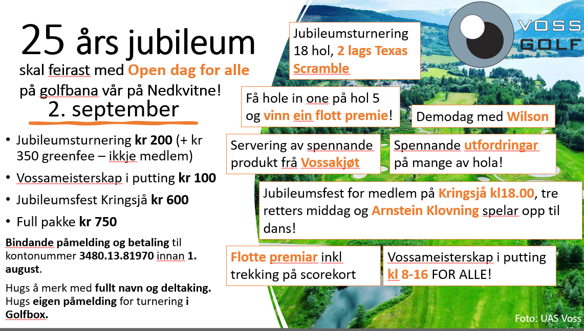 Voss Golfklubb 25 år! Golfklubben feirer 25 år i år og 2.september vert det mange aktivitetar for både små og store. Sjå plakat over for kva som skjer og meld deg på! Forrige Neste