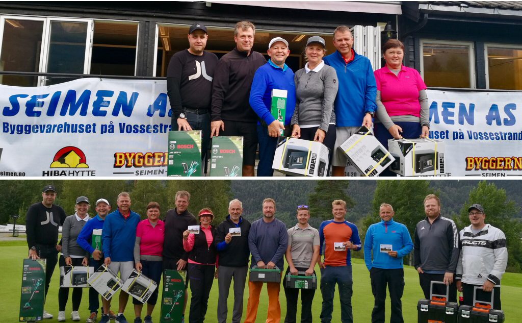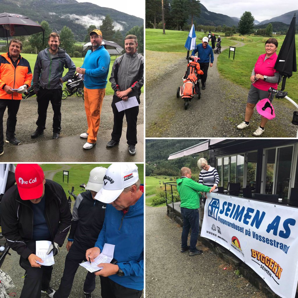 Ei flott golfhelg med Vossamesterskapet Open er over, og det spesielle i år var at vi hadde fått med oss Byggevarehuset Seimen AS på laget med fantastiske premiar i par mesterskapet på lørdag. Heile 48 deltakarar stilte til start på tross av YR sine litt dystre varsel.